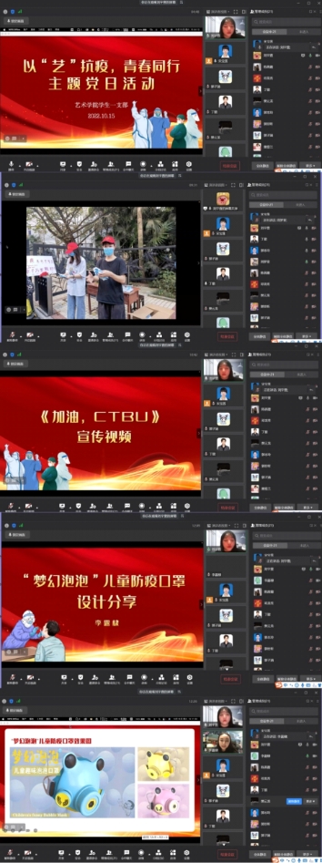 在学校遭遇新冠肺炎疫情“大考”,疫情防控形势严峻复杂之际,为凝心聚力,号召支部党员,敢担当,做表率,齐心战疫,10月15日下午15时,艺术学院学生第一党支部通过企业微信视频会议形式举办“以‘艺’抗疫,青春力行”主题党日活动,支部全体党员参加活动,刘宇萱担任主持人。