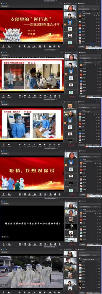 “阳光下,一位位勤劳的身影,化身为工商大的天使……我们坚信,疫情终会过去!美好即将来临!重庆加油!重工商大加油!”活动在支部书记宋宝莲老师、组织委员郭本玲老师、学生党员丁锴和周梦亚朗诵的《追光者》中拉开帷幕。随后,大家一起观看了由学校新闻中心出品的宣传视频《加油,CTBU》,同学们透过屏幕感受到疫情之下学校和老师们守护学生和校园的决心和勇气,不禁潸然泪下。