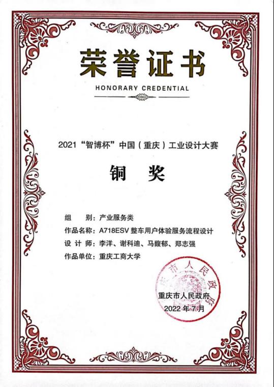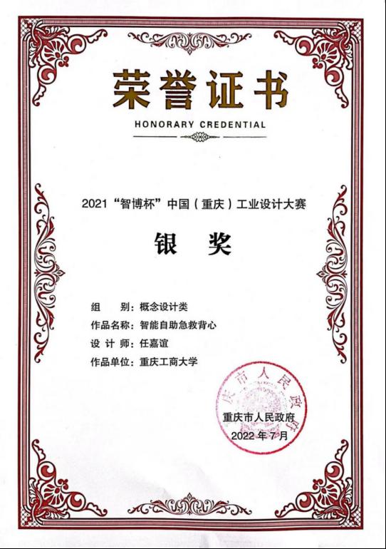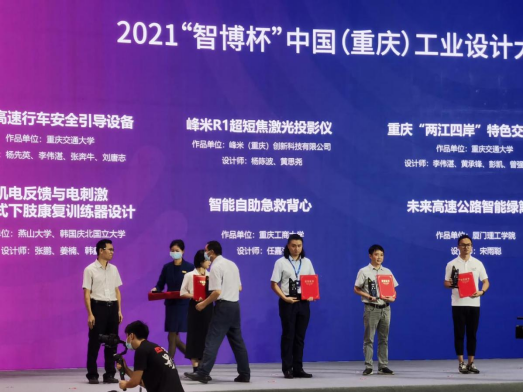 由重庆市人民政府主办,重庆市经济信息委、重庆市教委、重庆市巴南区政府和重庆市两江新区管委会联合承办的2021“智博杯”中国(重庆)工业设计大赛于近日举行了颁奖典礼。本次大赛中重庆工商大学艺术学院产品设计系学生任嘉谊的作品《智能自助急救背心》斩获银奖;艺术学院产品设计系教师李洋及重庆工商大学学生谢科迪、马馥郁、郑志强组成的设计团队而创作的作品《A718ESV整车用户体验服务流程设计》在本次大赛中斩获铜奖。艺术学院党委书记唐玺、副院长李洋、产品设计系主任龙圣杰、专任教师代表章波、李洋一行前往现场参加了颁奖典礼。