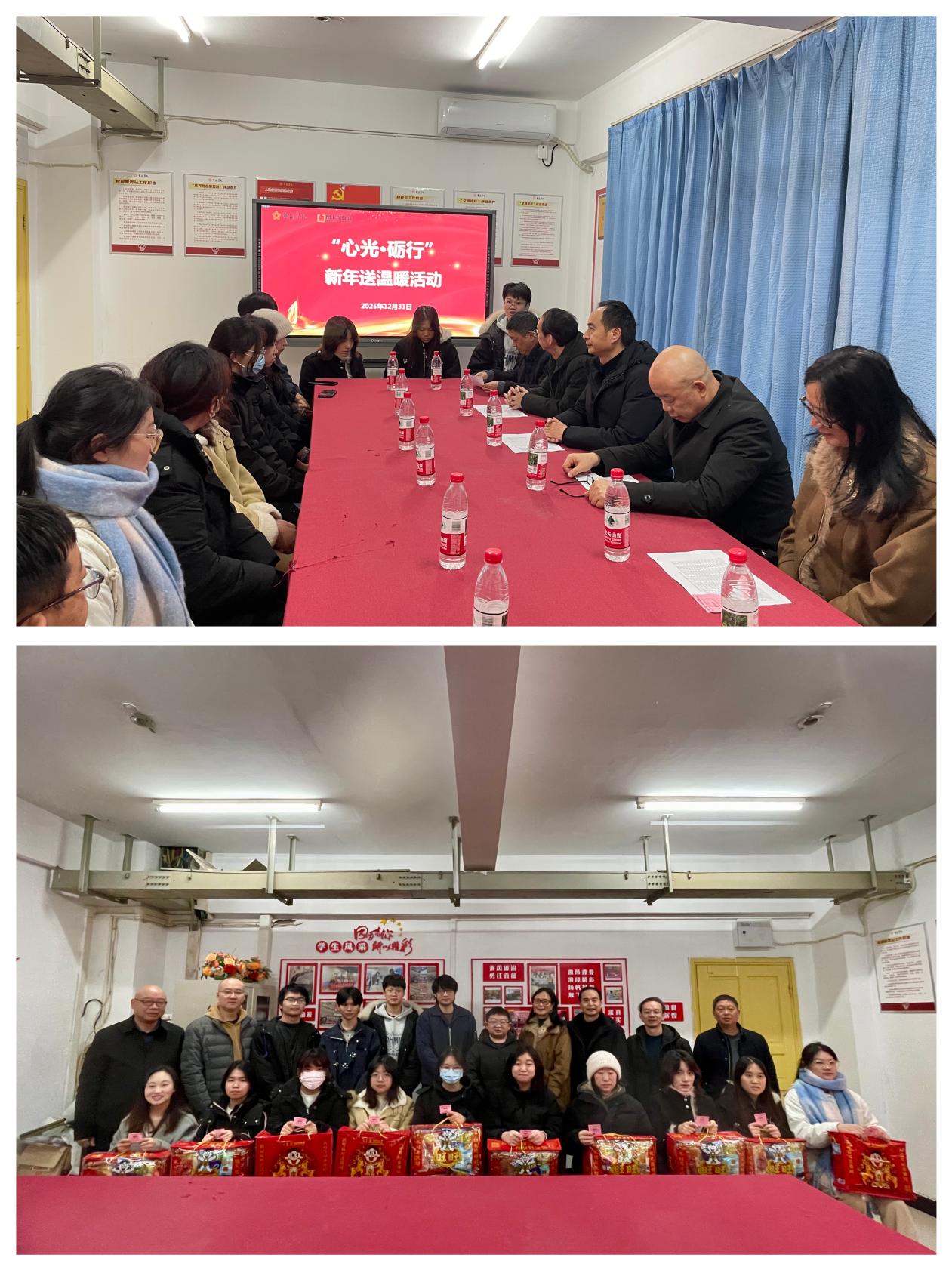 为切实关心关爱困难学生群体,让同学们在寒冬中感受到学校与学院的温暖关怀,12 月 31 日下午,艺术学院、现代国际设计艺术学院在兰花湖 “一站式” 社区联合开展困难学生元旦慰问活动。艺术两院全体院领导与部分困难学生代表齐聚一堂,共话成长、共迎佳节。